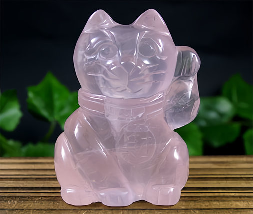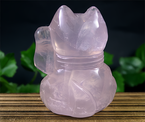 宝石のルースを作る、とても高品質なマダガスカルローズで製作した招き猫です。透明感のある、そのピンクが魅力的で、置いておくのではなく、思わず手に持ってすりすりしたくなる可愛さです。ご多分に漏れず、このネコ君には、スターローズ特有の条線が現れます。が、ネコ君は球面体では無い為、それは完璧な6条線という訳ではありません。実際は、手に取ってご覧下さい。