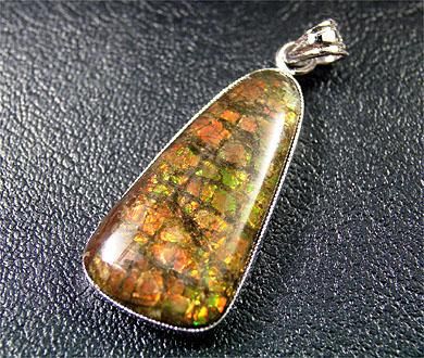 世界中でアンモナイトという化石は沢山産出されますが、イリデッセンス(遊色効果)を持ったものは、カナダはアルバータ州でのみ産出されます。このアンモライトはイリデッセンス効果が特に顕著で、角度により色々な表情を私達に見せてくれます。このアンモライトの輝きは、プラチナ箔をベースに使用した創作ガラス器の、色ガラスの下からギラギラ輝いてくる感じに非常によく似ています。勿論、ブラックオパールや、ボルダーオパールに勝るとも劣らない美しさです。