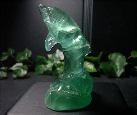透明感のあるグリーンフローライトで製作された、美しいカービングです。波の上に立ち上がって、このイルカ君はどこを見ているのでしょう?インテリアに、心の癒しにどうぞ!