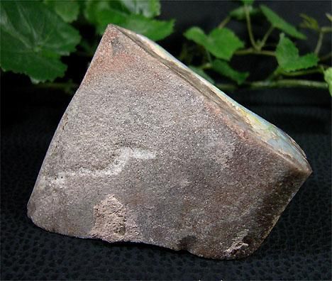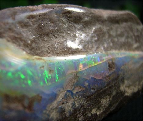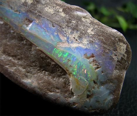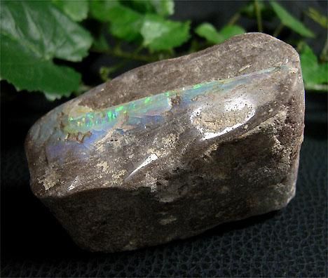 大きな原石の中央に帯状に入ったオパールは、プレイオブカラーと呼ばれる遊色効果がとても顕著で美しく、角度で変わる煌きには、魅了されます。母岩内には、さらなるオパールの塊が隠れているのではと、輝きの帯を見ては、想像するばかりです。少々贅沢な、ペーパーウエイト等としてご愛用下さい!